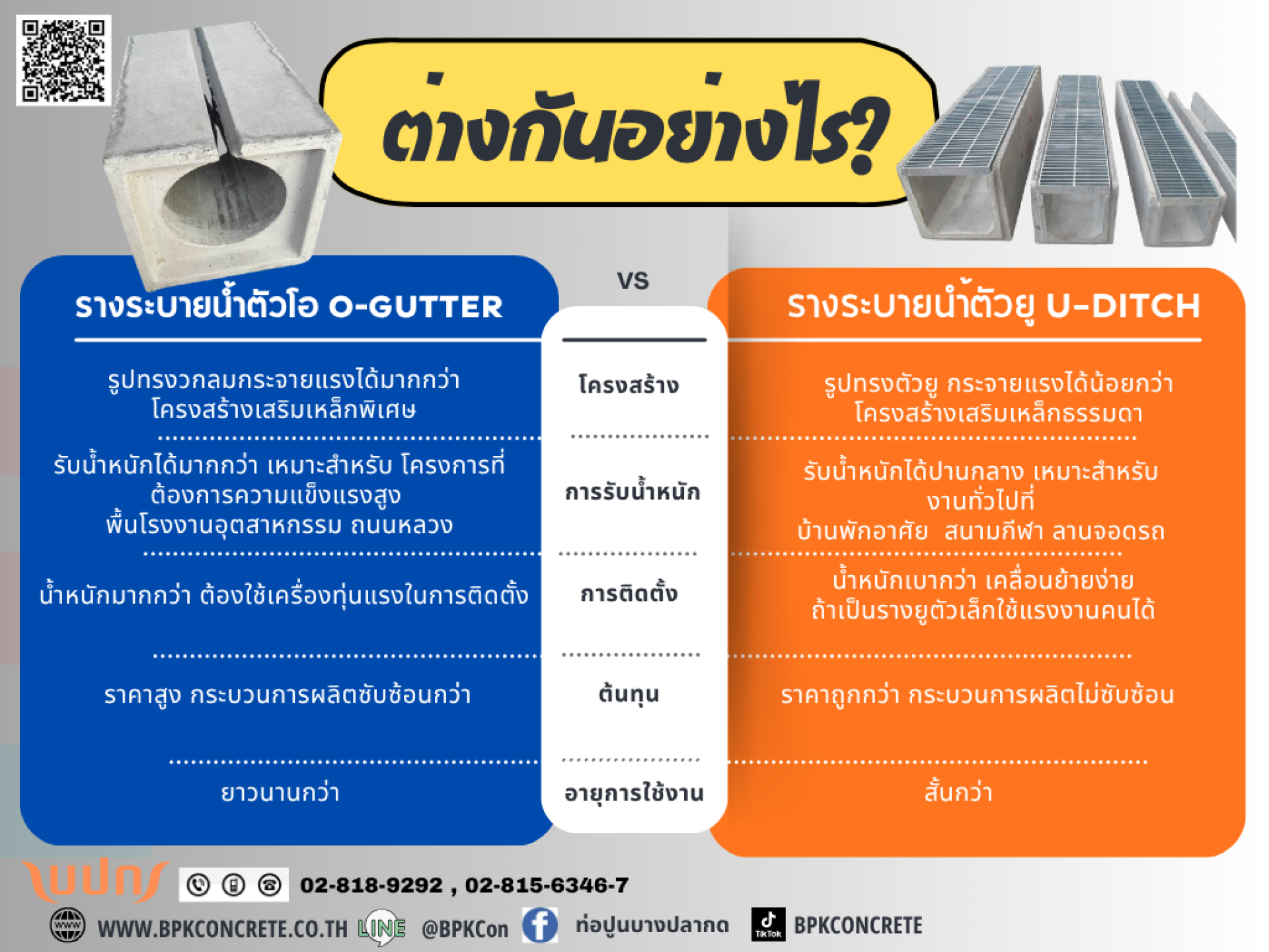 สรุป : ถ้าต้องการความแข็งแรง ทนทาน รับน้ำหนักรถบรรทุกผ่าน ใช้ รางระบายน้ำตัวโอO -GUTTER ต้องการความคุ้มค่า ติดตั้งง่าย ซ่อมบำรุงง่าย รับน้ำหนักปานกลาง ใช้ รางระบายน้ำตัวยูU-DITCH แต่สิ่งสำคัญคือ การเลือกใช้ให้เหมาะสมกับประเภทงานจริง จะเกิดความคุ้มค่าและ ได้ประโยชน์สูงสุด